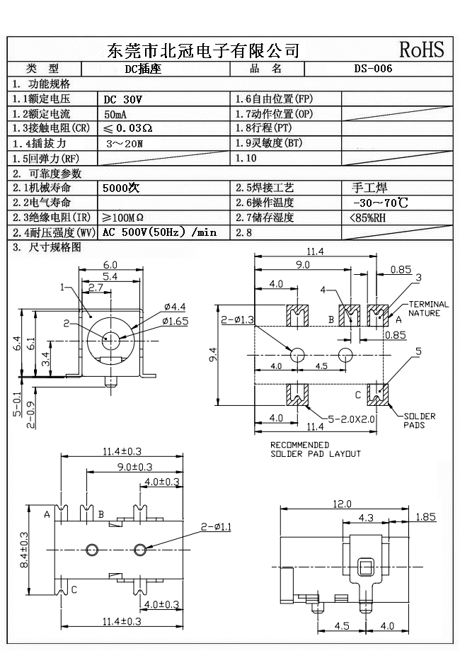 Typical Specifications 1. Rating : DC 30V 0.5A 2. Contact Resistance : 70?Max 3.Lnsulation Resistance: DC500V 1Minute 4.Operating Temperature Range: -25℃+80℃ 5.Ambient Humidity Used: ≤85%RH 6. Operating Force : 3-20N 7. Operating Life : 5,000Cycles
