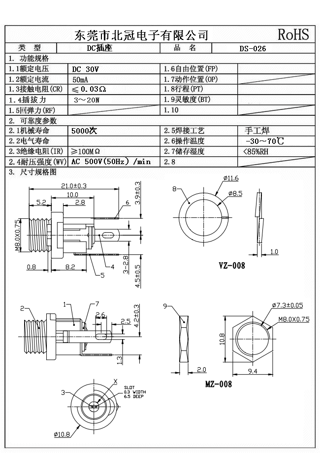 Typical Specifications 1. Rating : DC 30V 0.5A 2. Contact Resistance : 70ΩMax 3.Lnsulation Resistance: DC500V 1Minute 4.Operating Temperature Range: -25℃+80℃ 5.Ambient Humidity Used: ≤85%RH 6. Operating Force : 3-20N 7. Operating Life : 5,000Cycles