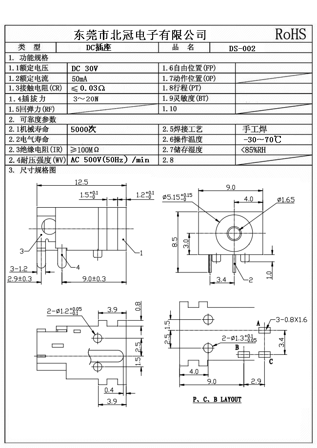 Typical Specifications 1. Rating : DC 30V 0.5A 2. Contact Resistance : 70ΩMax 3.Lnsulation Resistance: DC500V 1Minute 4.Operating Temperature Range: -25℃+80℃ 5.Ambient Humidity Used: ≤85%RH 6. Operating Force : 3-20N 7. Operating Life : 5,000Cycles