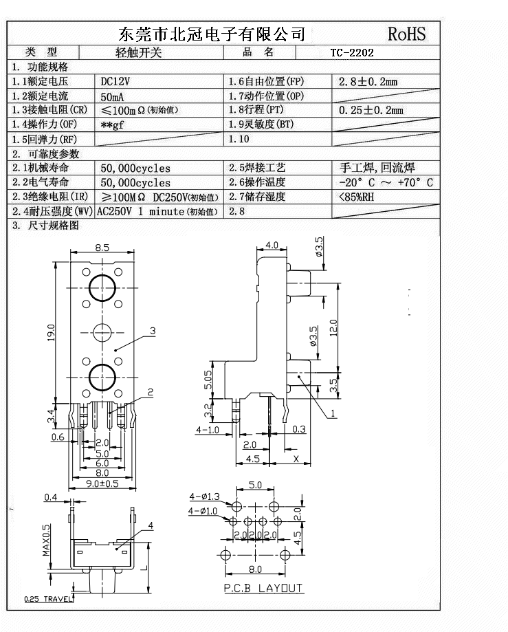 Typical Specifications 1.Rating : DC 12V 50mA 2.Contact Resistance: ≤100mΩ 3.Lnsulation Resistance: ≥100mΩ DC250V 4.Operating Temperature Range: -25℃+80℃ 5.Ambient Humidity Used: ≤85%RH 6.Operating Force : 180gf,250gf 7.Travel:0.25±0.1mm 8.Life : 100,000 Cycles