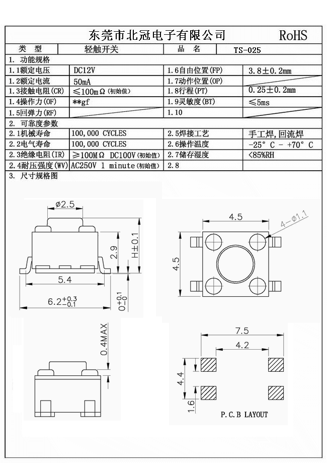 產(chǎn)品名稱:TS-025輕觸開關