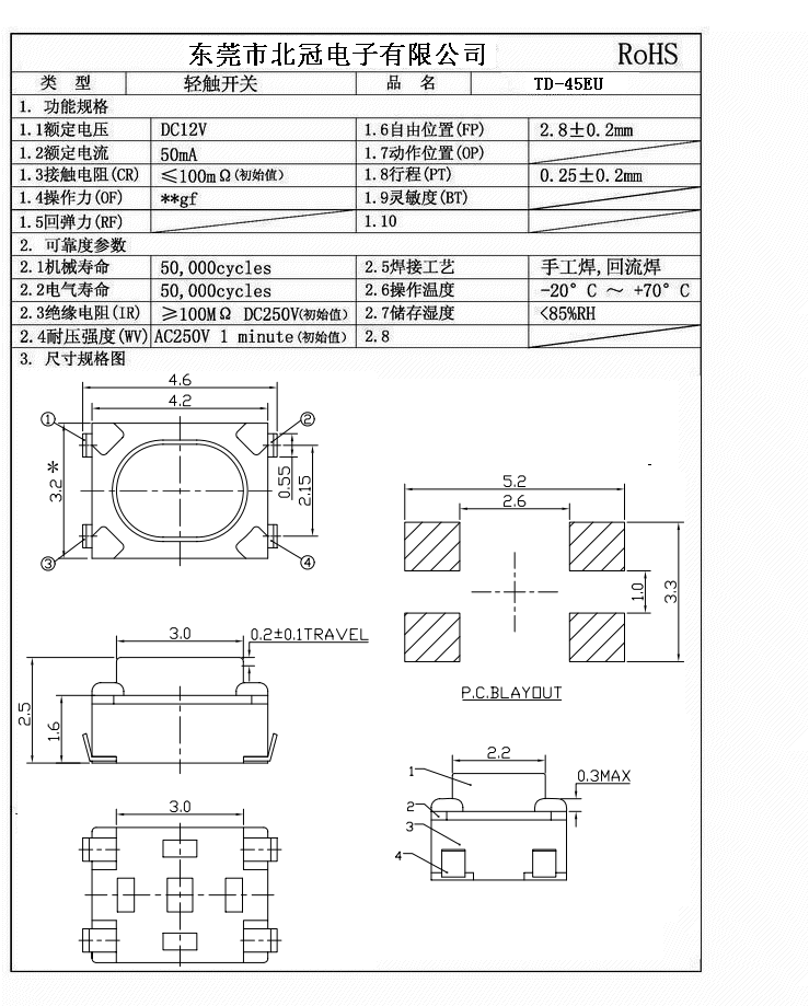 產(chǎn)品名稱:TD-45EU輕觸開關(guān)
