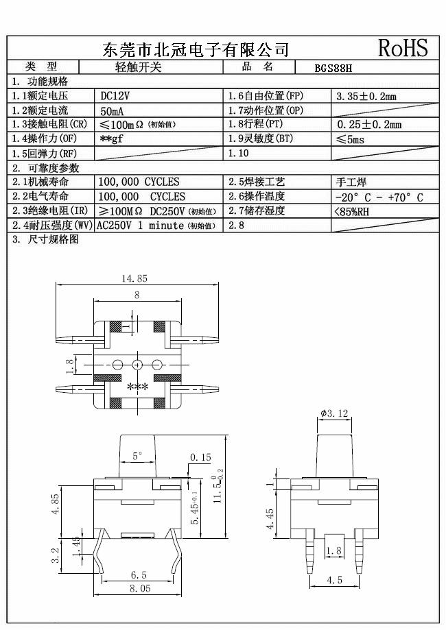3.Lnsulation Resistance: ≥100mΩ DC250V