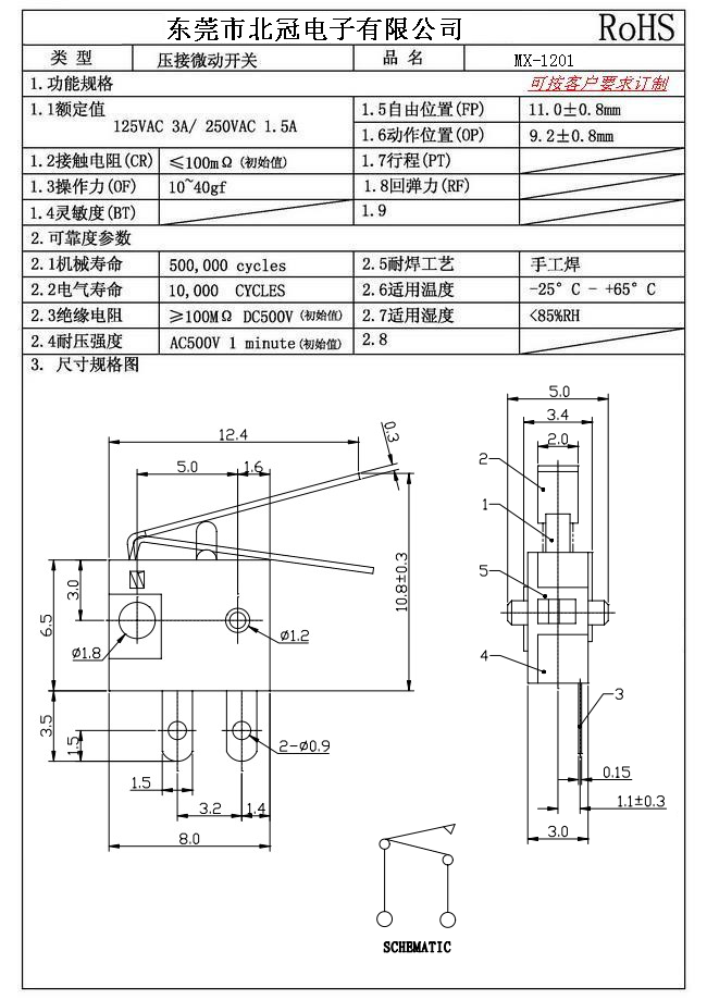 Typical Specifications 1.Rating : DC30V 0.1A 2.Contact Resistance: ≤100mΩ 3.Lnsulation Resistance: ≥100mΩ DC500V 4.Operating Temperature Range: -25℃+85℃ 5.Ambient Humidity Used: ≤85%RH 6.Mechanical Life: 100,000Cycles 7.Operating Force:30±10gf 8.OP:8.8±0.8mm 9.Order: AC 125V 3A