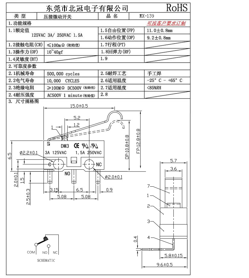 Typical Specifications 1.Rating : DC30V 0.1A 2.Contact Resistance: ≤100mΩ 3.Lnsulation Resistance: ≥100mΩ DC500V 4.Operating Temperature Range: -25℃+85℃ 5.Ambient Humidity Used: ≤85%RH 6.Mechanical Life: 100,000Cycles 7.Operating Force:30±10gf 8.OP:8.8±0.8mm 9.Order: AC 125V 3A