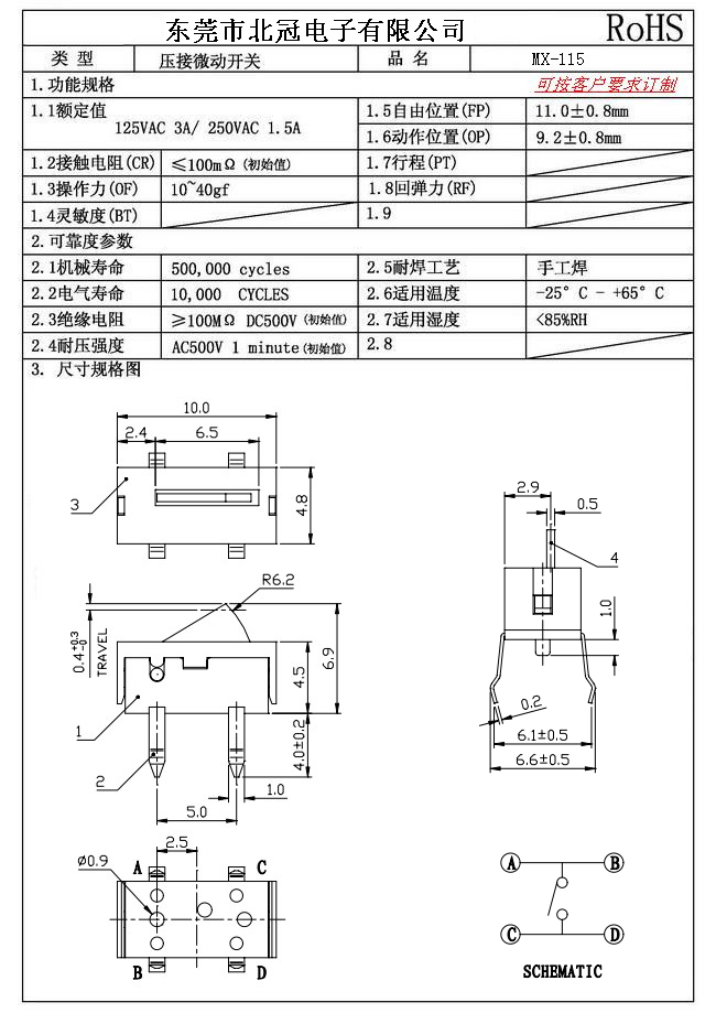 Typical Specifications 1.Rating : DC30V 0.1A 2.Contact Resistance: ≤100mΩ 3.Lnsulation Resistance: ≥100mΩ DC500V 4.Operating Temperature Range: -25℃+85℃ 5.Ambient Humidity Used: ≤85%RH 6.Mechanical Life: 100,000Cycles 7.Operating Force:30±10gf 8.OP:8.8±0.8mm 9.Order: AC 125V 3A
