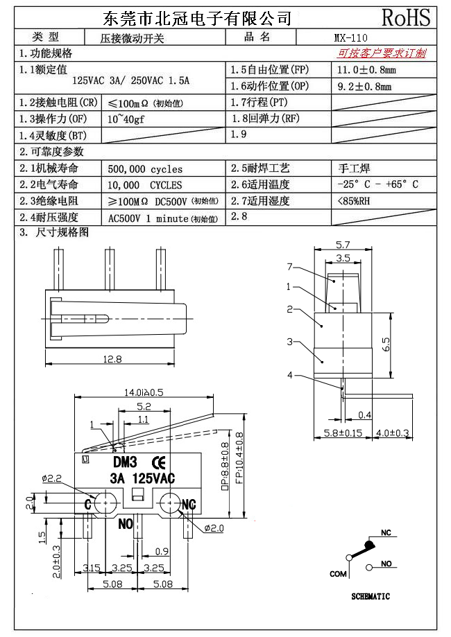 Typical Specifications 1.Rating : DC30V 0.1A 2.Contact Resistance: ≤100mΩ 3.Lnsulation Resistance: ≥100mΩ DC500V 4.Operating Temperature Range: -25℃+85℃ 5.Ambient Humidity Used: ≤85%RH 6.Mechanical Life: 100,000Cycles 7.Operating Force:30±10gf 8.OP:8.8±0.8mm 9.Order: AC 125V 3A