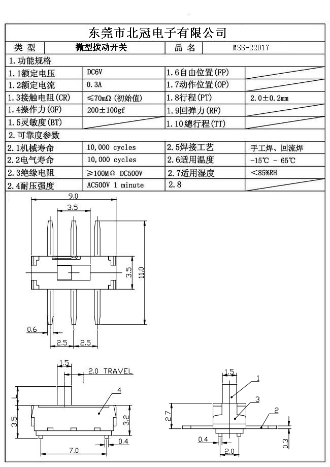 Typical Specifications 1. Rating : DC 12V 50mA 2. Contact Resistance :≤50mΩ 3.Lnsulation Resistance: DC500V 1Minute 4.Operating Temperature Range: -25℃+80℃ 5.Ambient Humidity Used: ≤85%RH 6. Operating Force : 200gf 7. Operating Life : 10,000Cycles