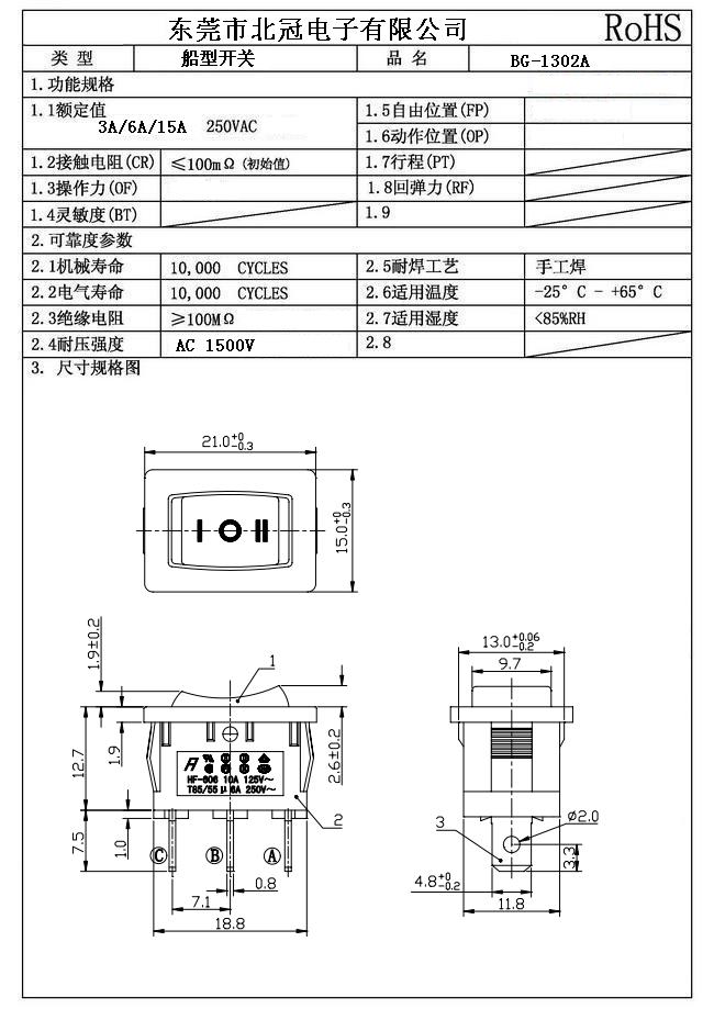 技術(shù)參數(shù)〔SPECIFICATION〕 額定電流、電壓: 6(4)A 250VAC 6A/125A 250VAC 6A 250VAC/10A 125VAC 接觸電阻:≤20mΩ 絕緣電阻:≥100MΩ 介電強(qiáng)度:≥1800VAC/3S 電器壽命:≥10000次