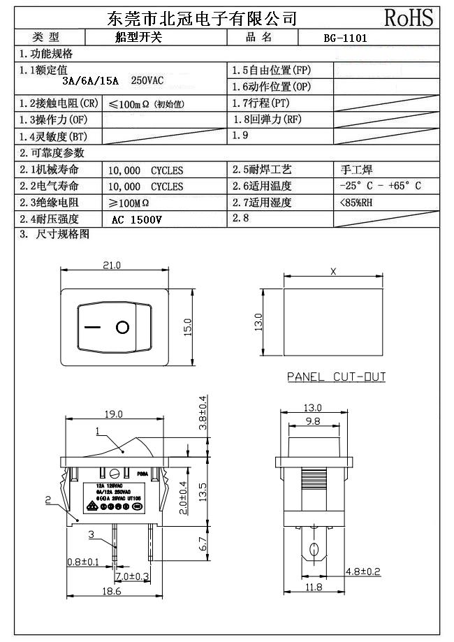 技術(shù)參數(shù)〔SPECIFICATION〕 額定電流、電壓: 6(4)A 250VAC 6A/125A 250VAC 6A 250VAC/10A 125VAC 接觸電阻:≤20mΩ 絕緣電阻:≥100MΩ 介電強(qiáng)度:≥1800VAC/3S 電器壽命:≥10000次